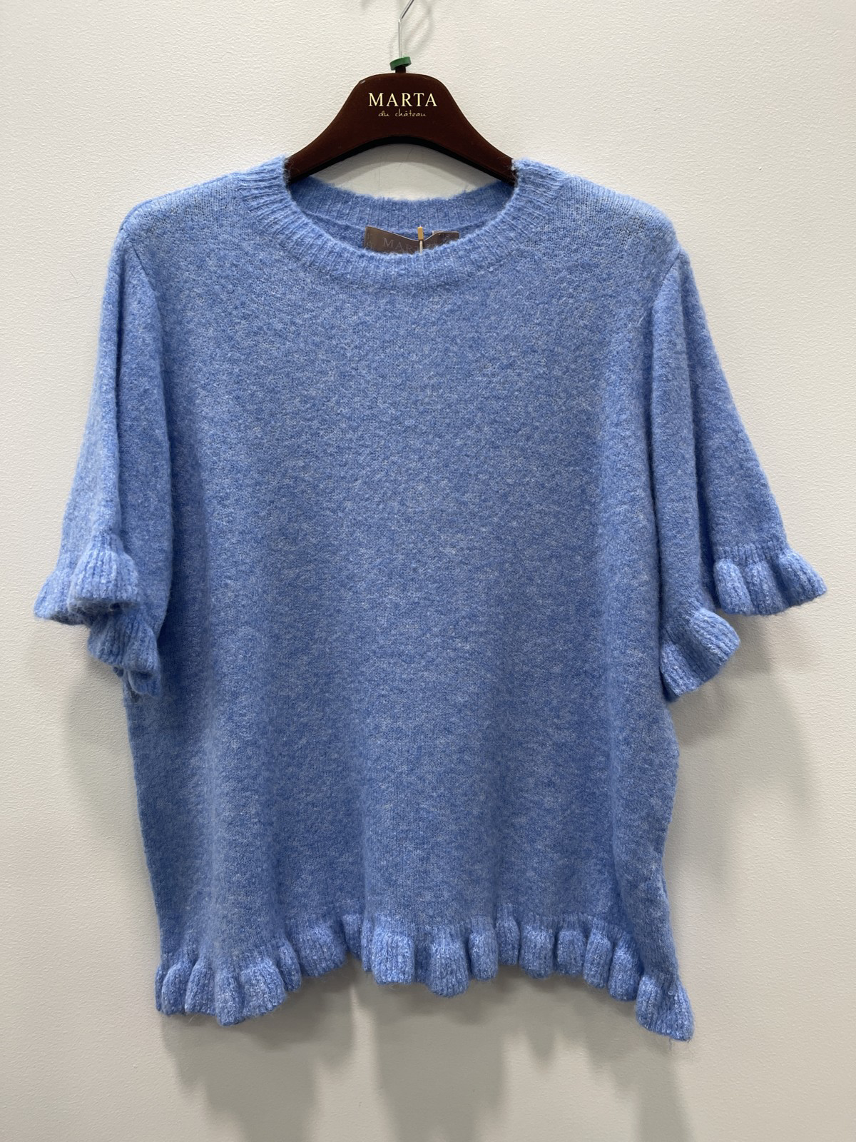 Fin kortærmet strik fra Marta. Den har rund halsudskæring med. Blød og fluffy tekstur som giver et feminint og afslappet udtryk. Brug den med en stribet eller mønstert langærmet t-shirt under.