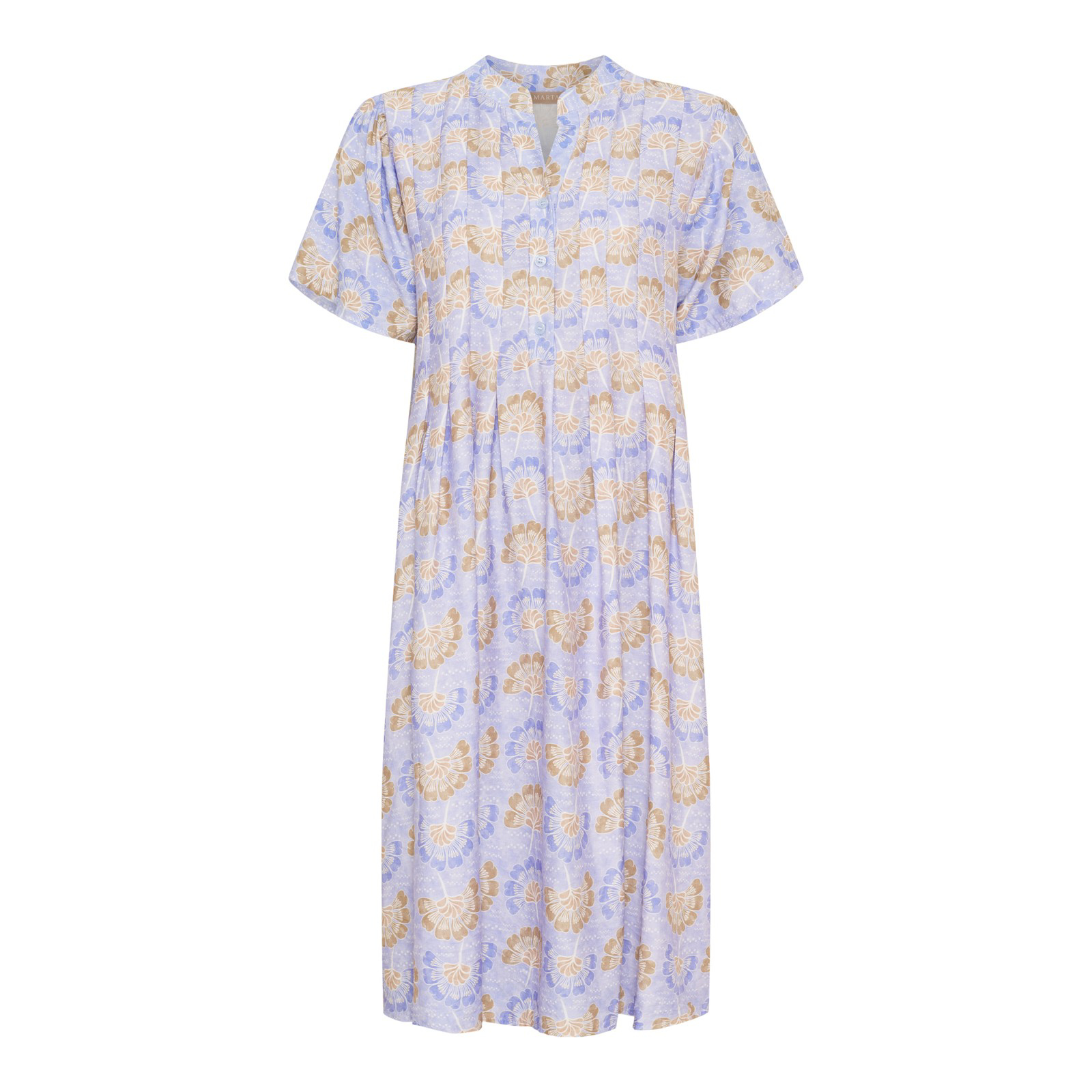 Skøn let og feminin viskose kjole fra Marta. Kjolen har korte ærmer, let puf på skulderen og stolpelukning. På bærestykket er der fine læg detaljer. Pefekt sommerkjole som kanb styles på mange måder.