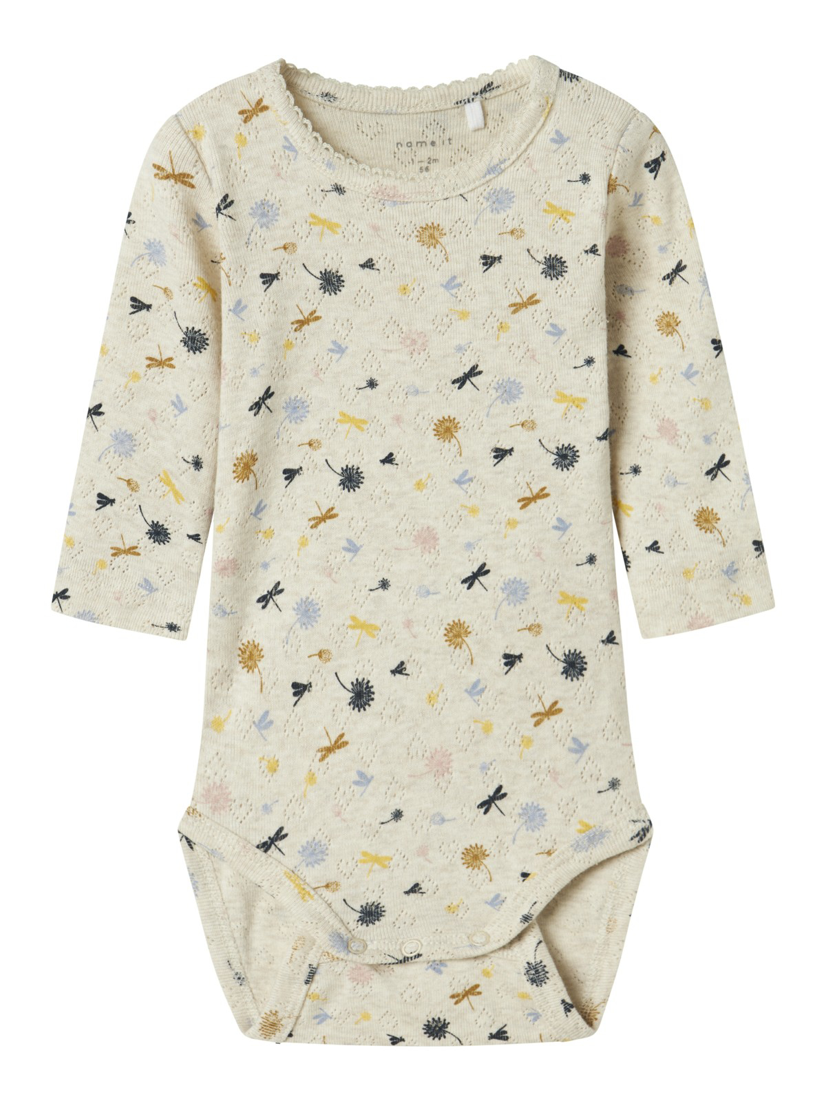Sød Hummel Body fra Hummel til pige i råhvid med små Hummel logoer i forskellige farver over det hele. Den har praktiske trykknapper ved skulder og gylp.