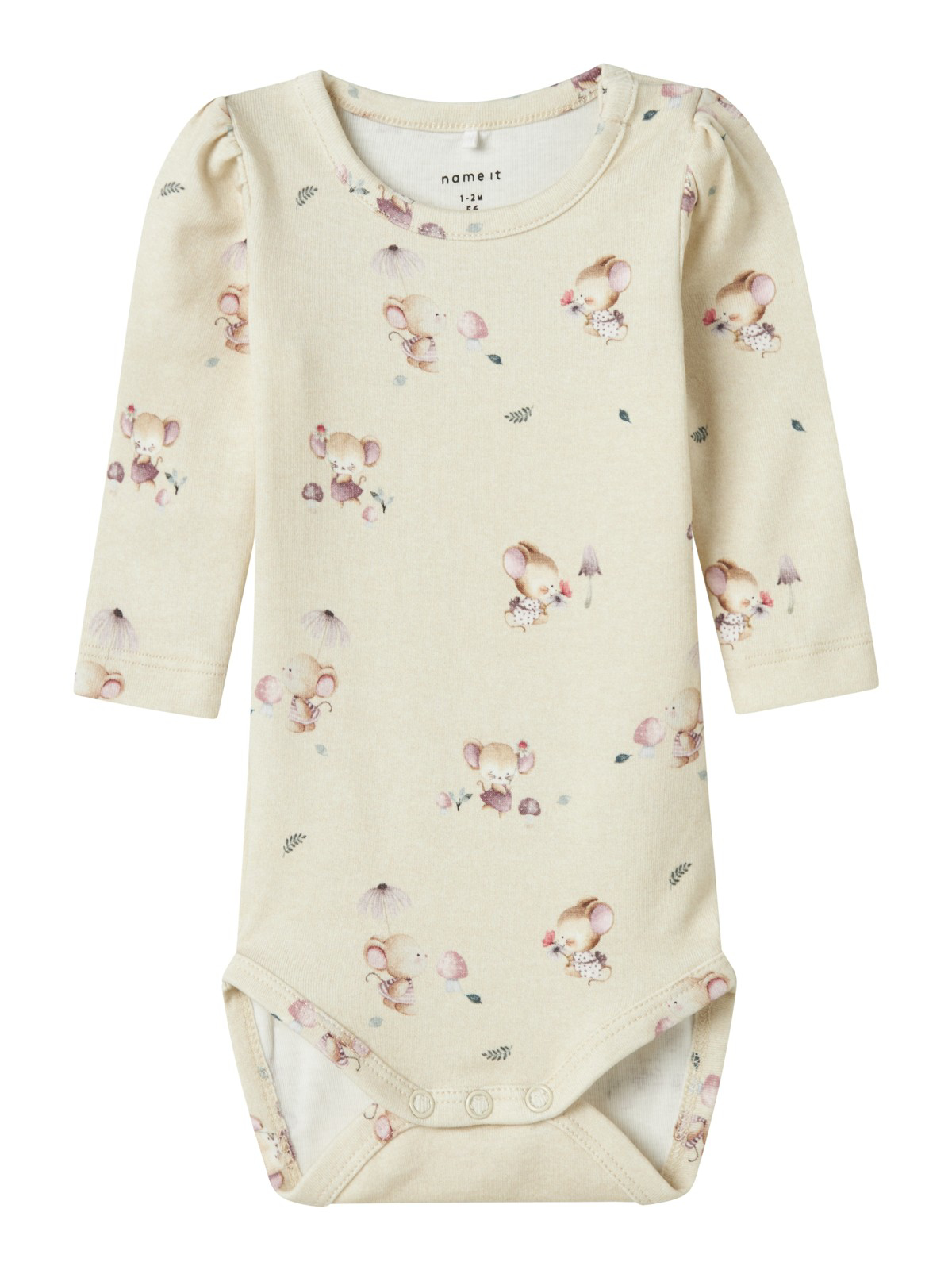 Super sød Hummel body i rosa eller grøn. Foran er der print med logo. Bodyen har lange ærmer med flæser, og den har praktiske trykknapper på venstre skulder og mellem benene.