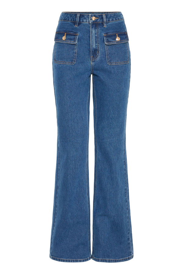 Smarte bløde og lette denim bukser. Buksen er fra Nümph og har en høj talje med vidde i benene. Der er skrå sidelommer og paspolrede baglommer. De er meget stretchy og bløde som giver en god komfort og pasform.
