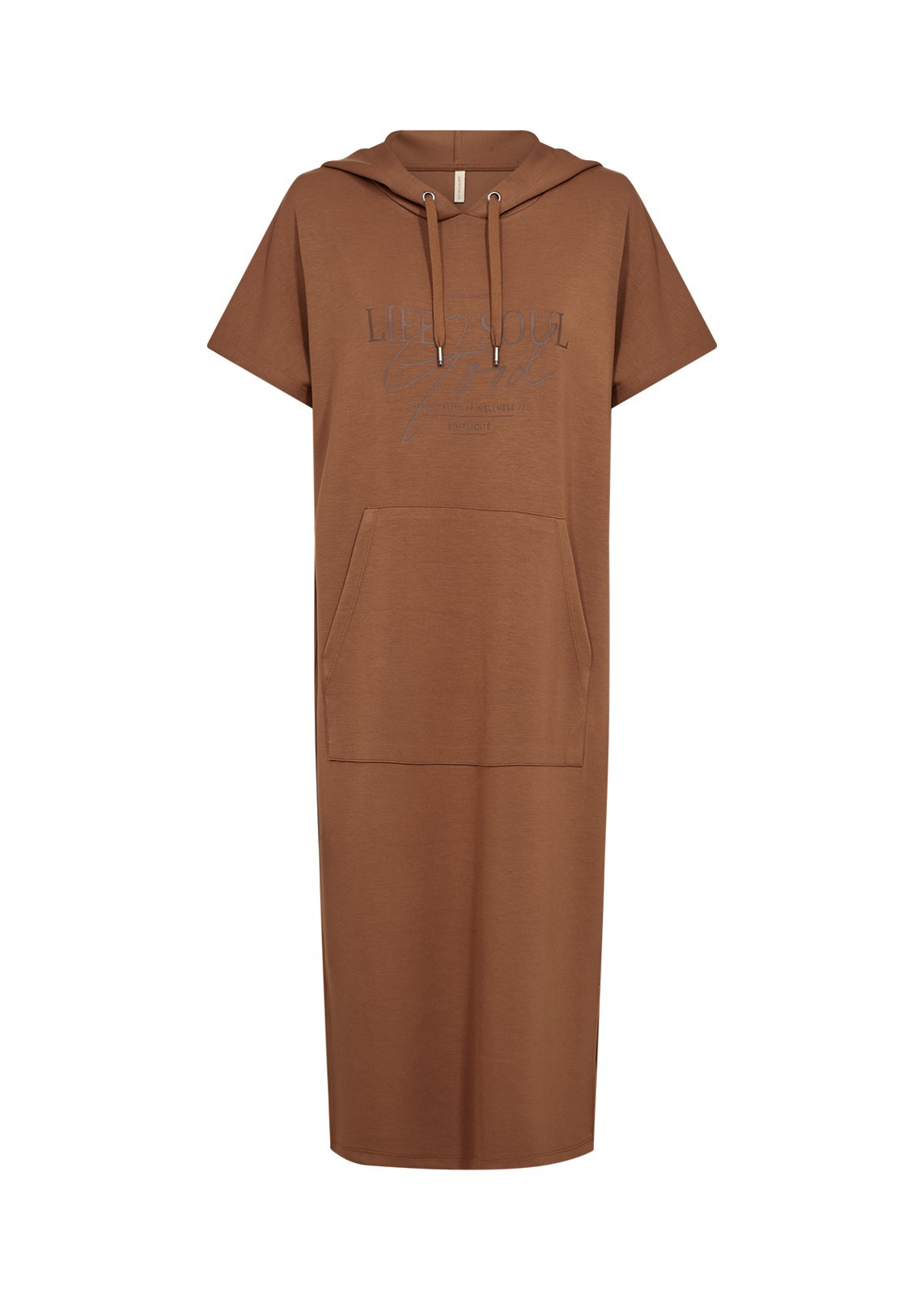 Smart og sporty Banu kjole fra Soya Concept. Kjolen har hætte, korte ærmer, en stor lomme foran og diskret tekstprint foran. Den er fremstilet i den gode bløde og komfortable Banu kvalitet.