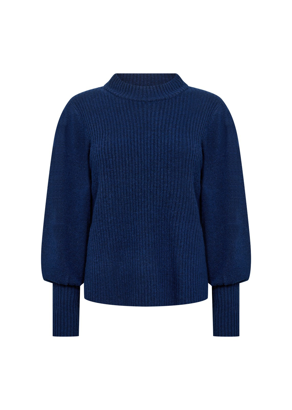 Nessie Pullover fra Soya Concept har en høj halsudskæring, lange ballonærmer og en behagelig pasform. Den har en stribet struktur på front og ryg som giver lidt liv og kabt til strikken.