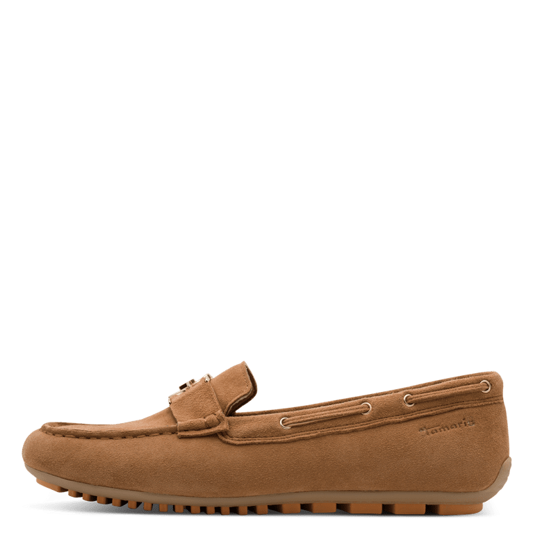 Håndlavede loafers i gyldenbrunt ruskind med rund snude. Loaferen er dekoreret med en rem foran, der har en udskæring i midten. Loaferen har også en blød, polstret indersål for optimal komfort.